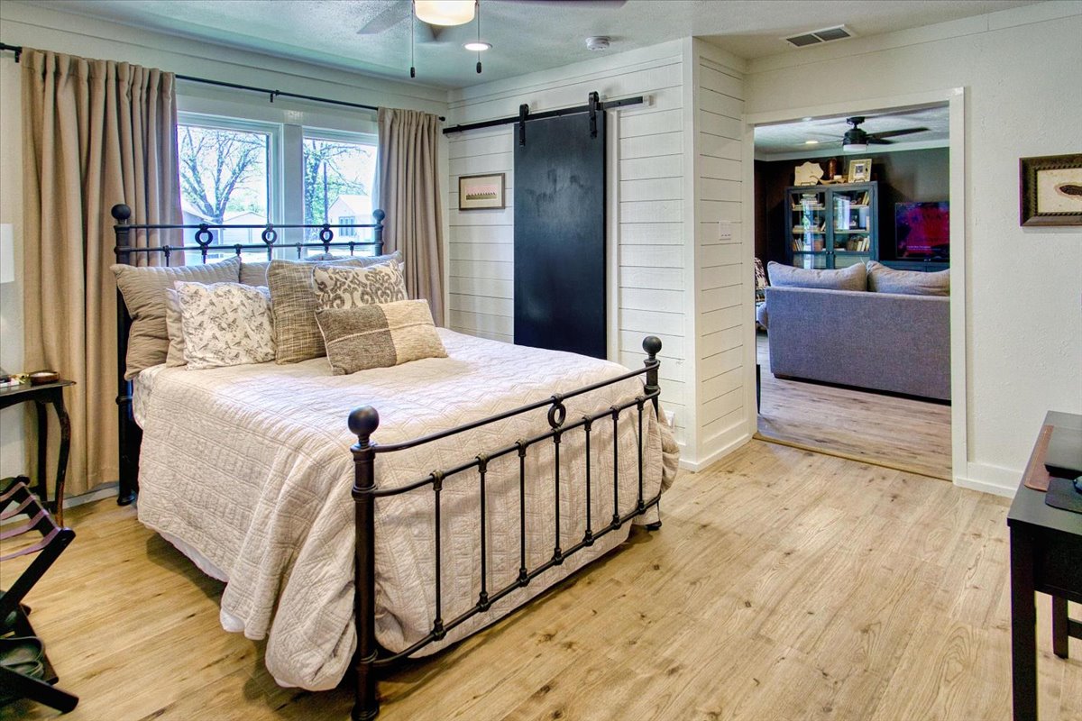 Located just a short walk from Mason ISD, this 2-bedroom, 1.5-bath home has been thoughtfully remodeled to offer both style and function inside and out. Dramatic accent walls add character and panache, while the large windows flood the space with natural light, keeping the home bright and airy. The open layout features durable laminate floors throughout, and the bedrooms are uniquely designed to maximize comfort and charm. The spacious master bathroom offers a relaxing tub-shower combo, perfect for unwinding.