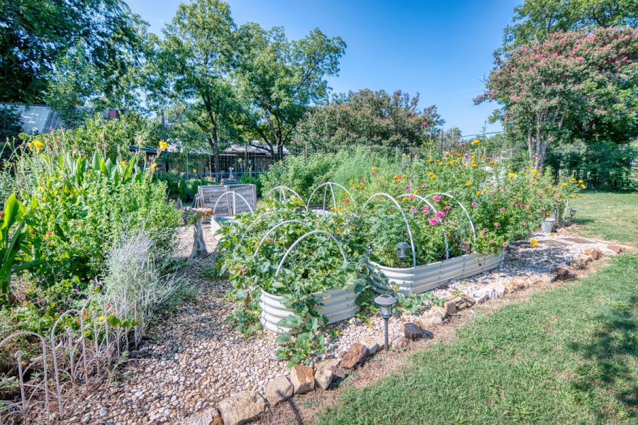 Outside, a screened porch with ceiling fans overlooks a fenced backyard full of fruit trees—peach, apricot, and fig—as well as a thriving garden area. The air-conditioned shop provides extra space for laundry, storage, or hobbies, and the carport offers covered parking.