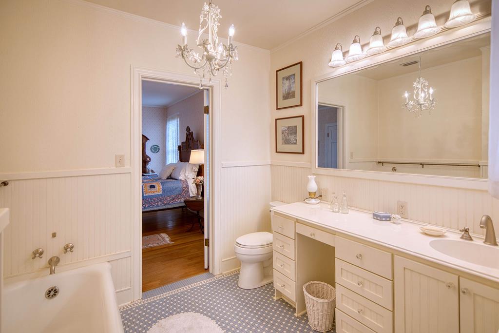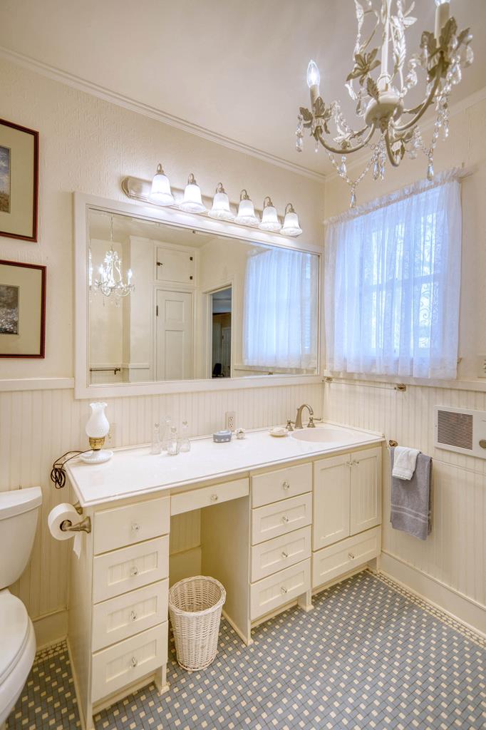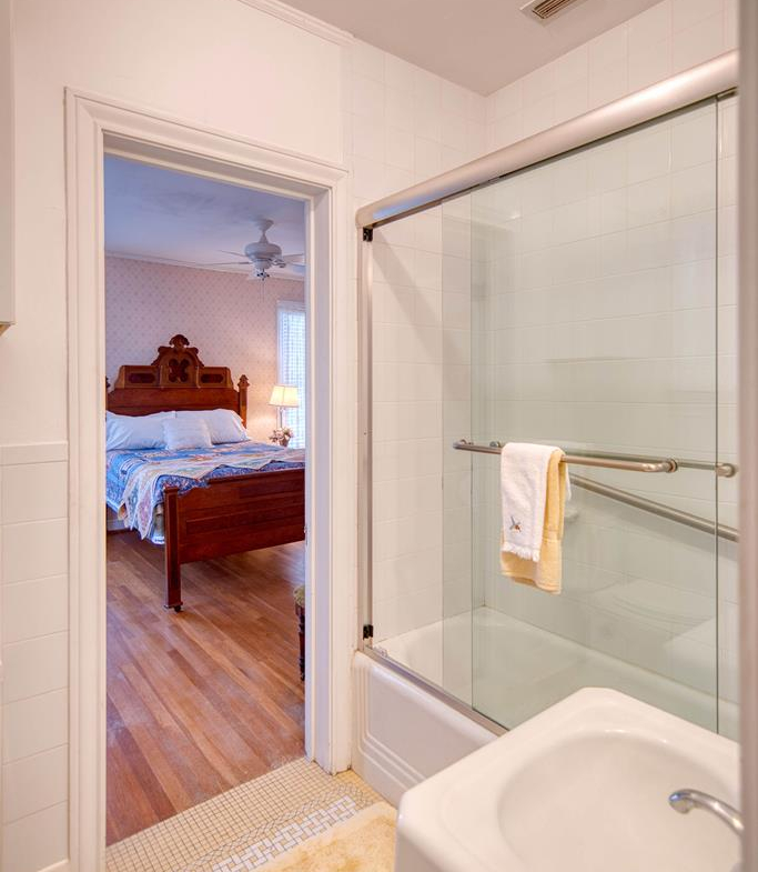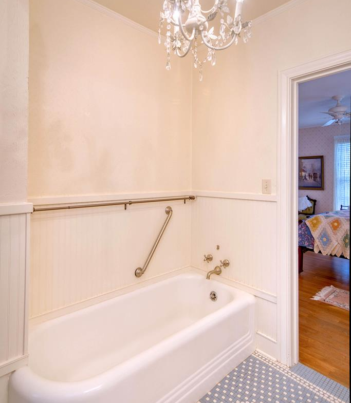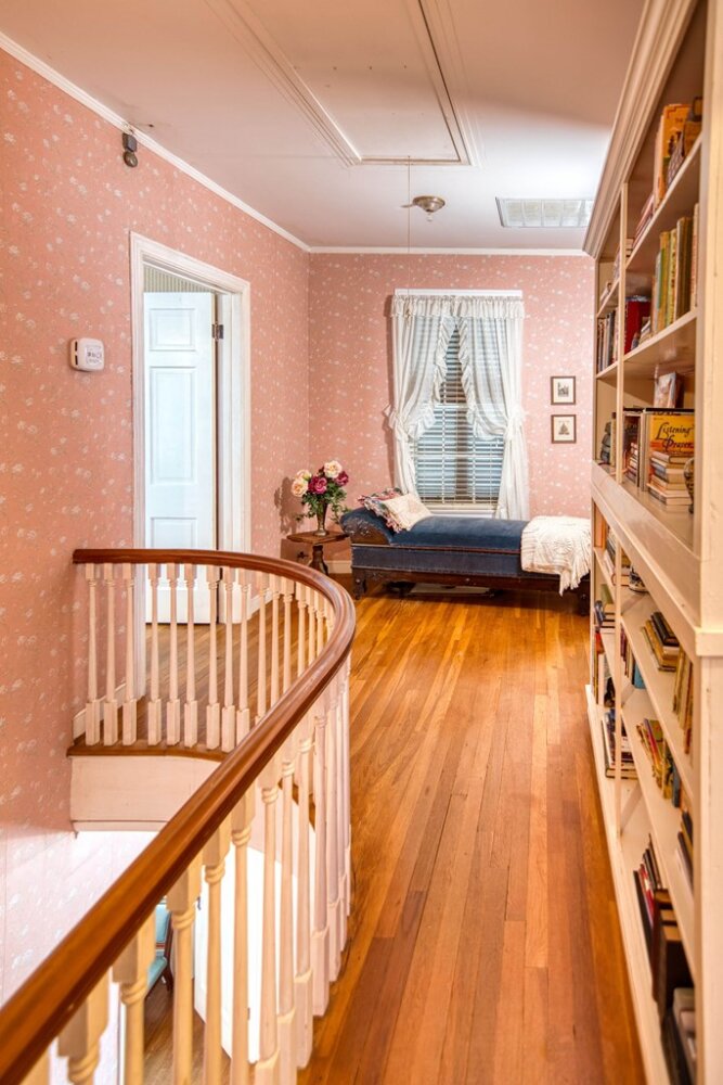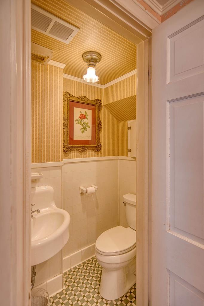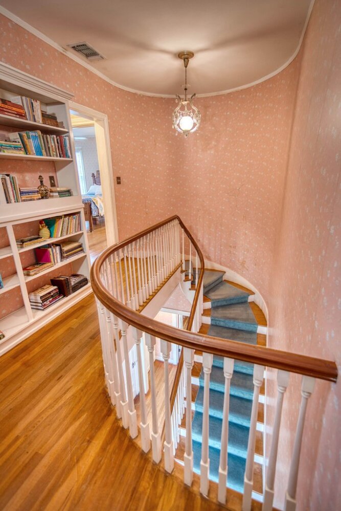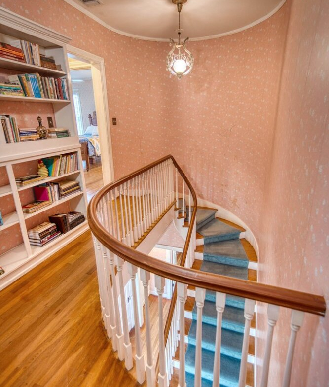 The curved staircase leads upstairs to a secondary master bedroom with fireplace, two additional bedrooms and two full baths, each carefully preserved with original cast iron tubs and vintage mini mosaic tile flooring.