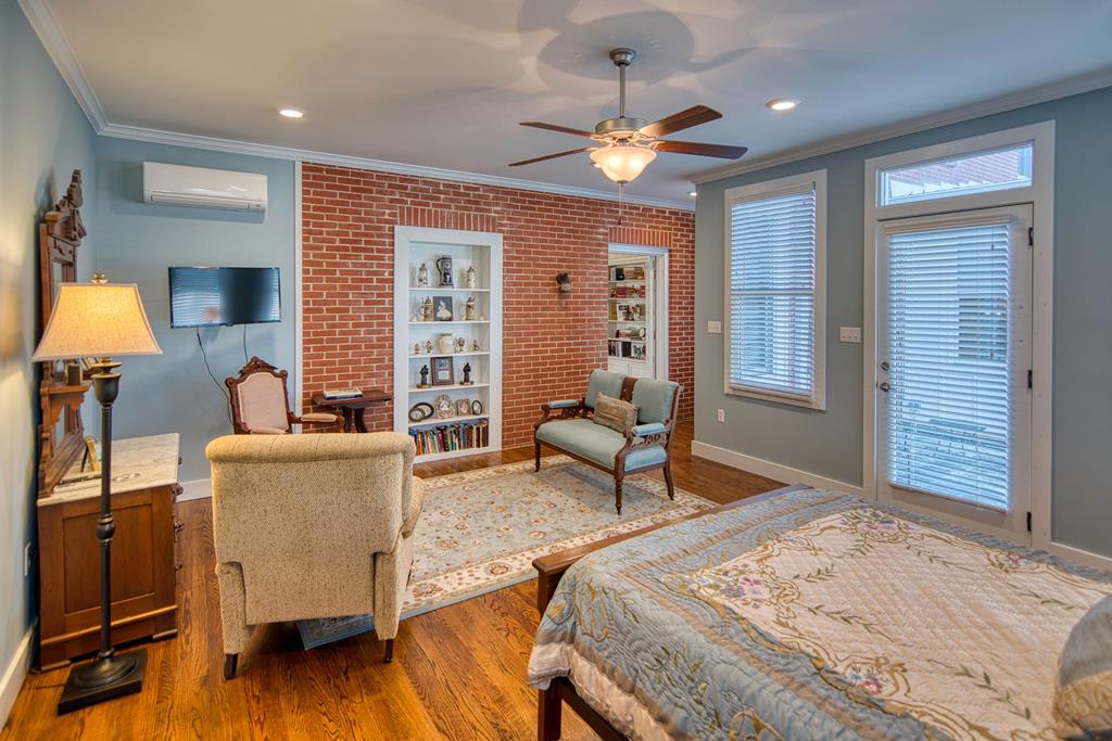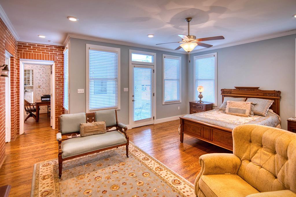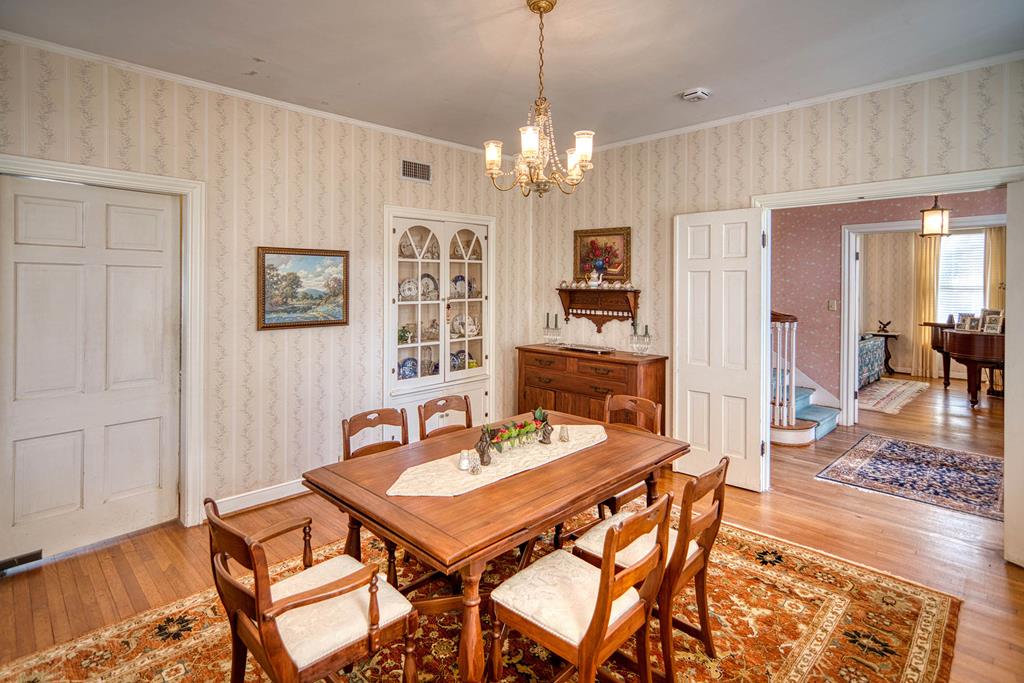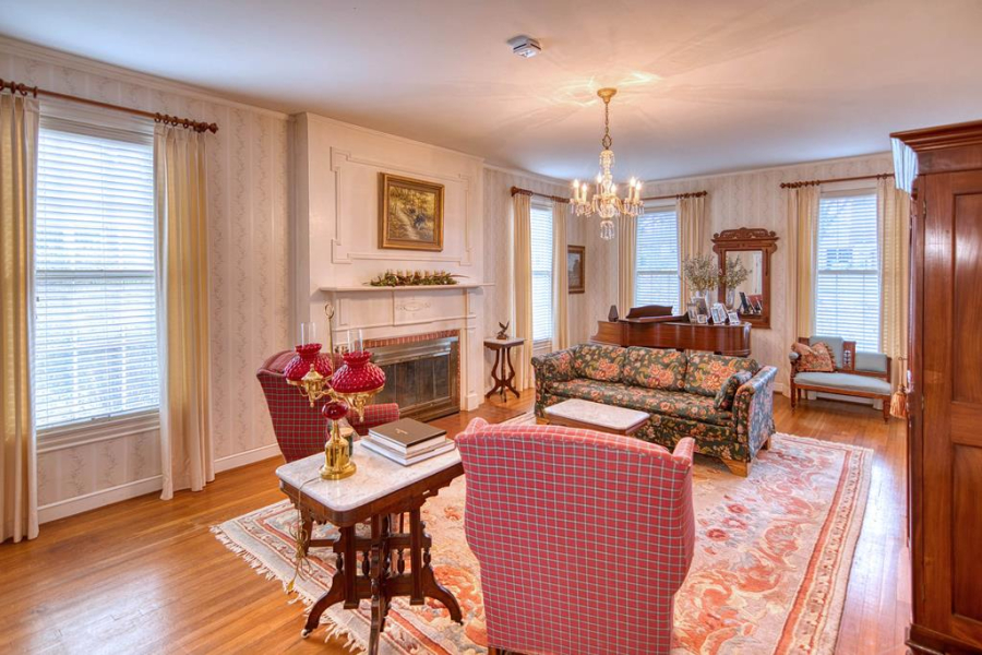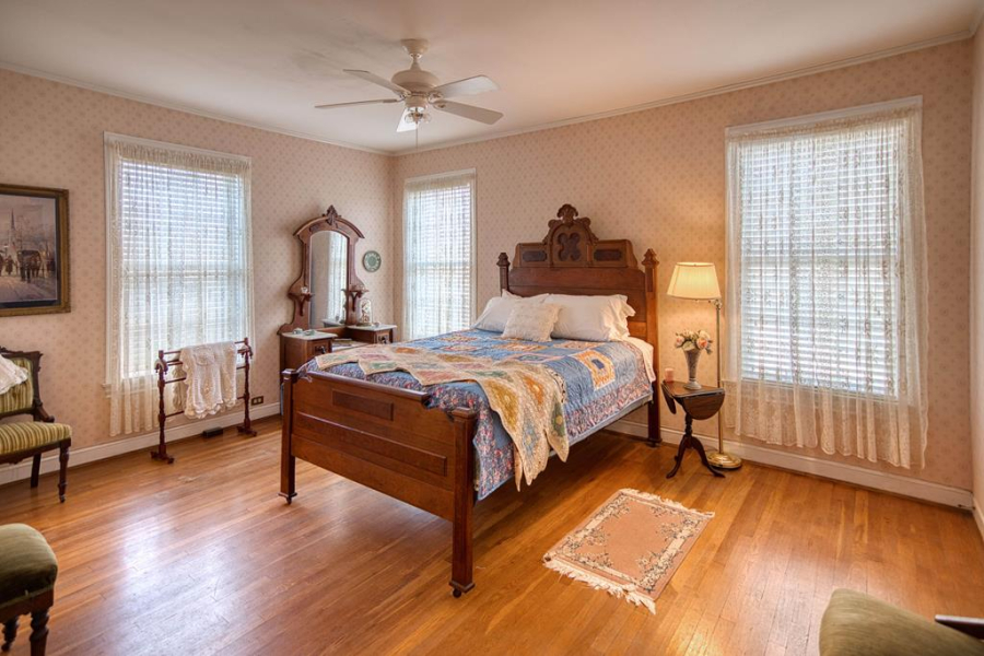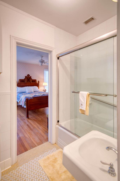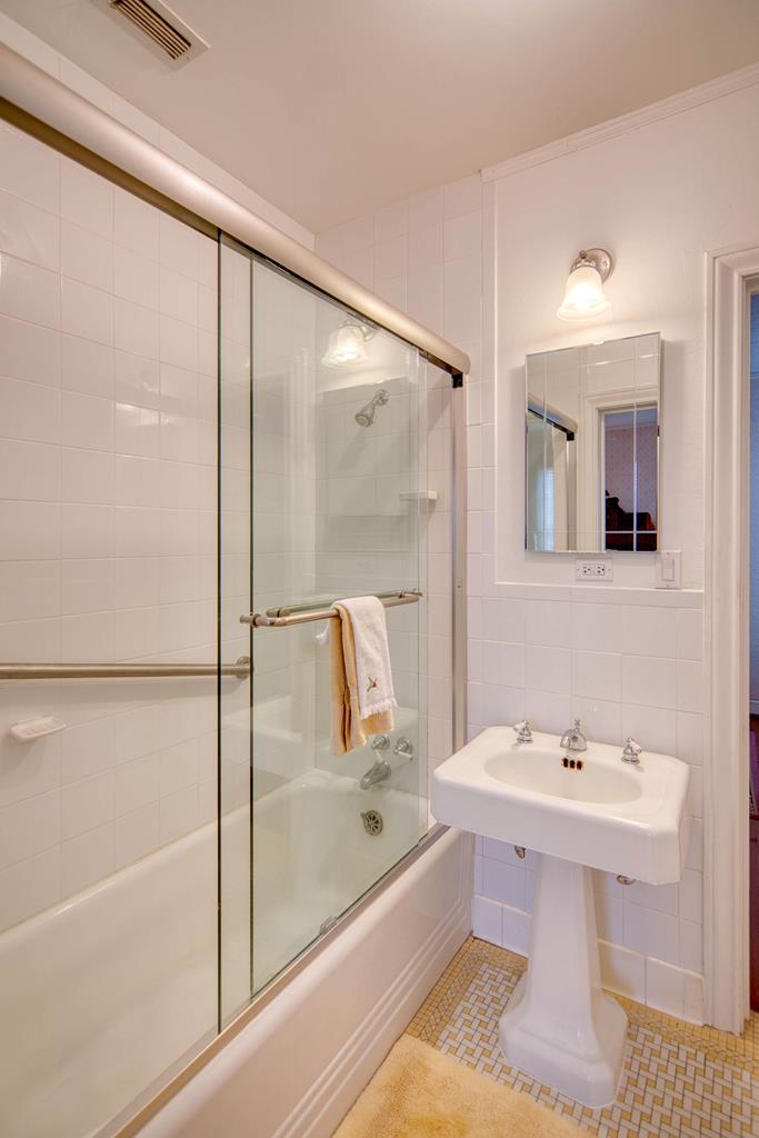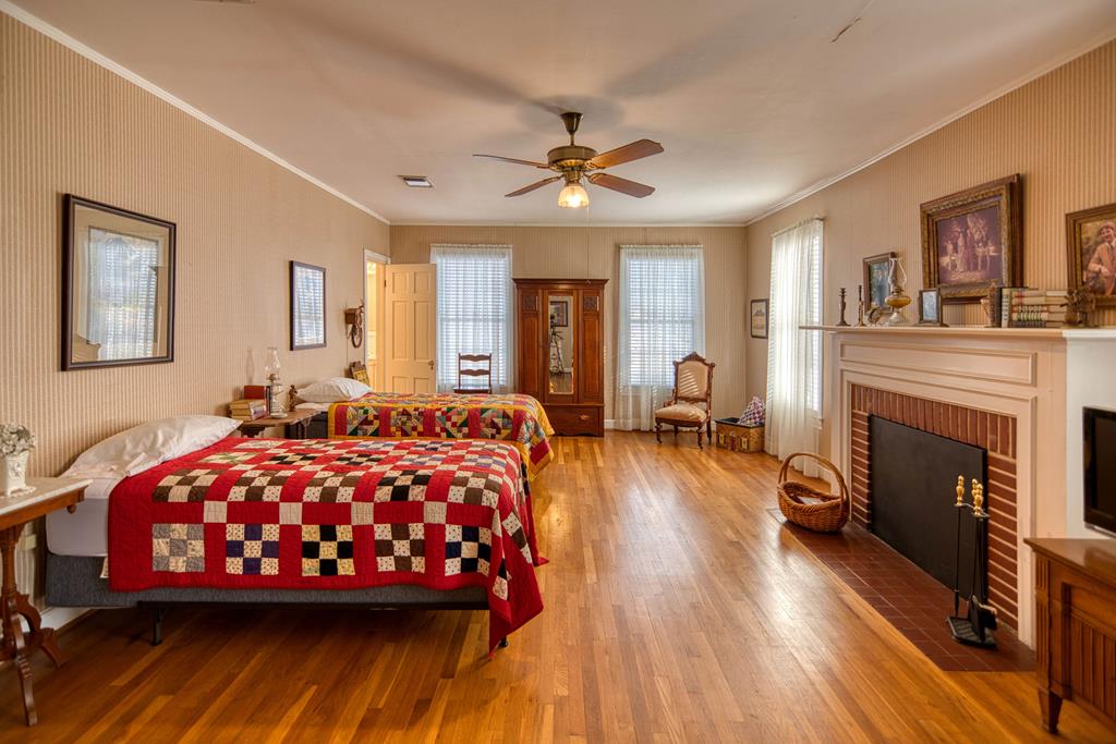 The curved staircase leads upstairs to a secondary master bedroom with fireplace, two additional bedrooms and two full baths, each carefully preserved with original cast iron tubs and vintage mini mosaic tile flooring.