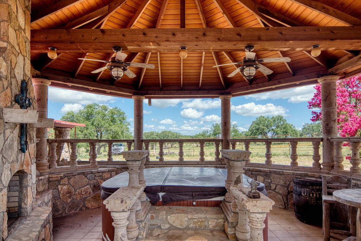 Deep porches wrap around the home, giving you plenty of shaded spots to kick back and enjoy the surrounding scenery. The outdoor entertainment setup is exceptional, featuring multiple BBQ pits, shaded gathering areas, and custom rockwork patios designed for everything from intimate dinners to large celebrations.