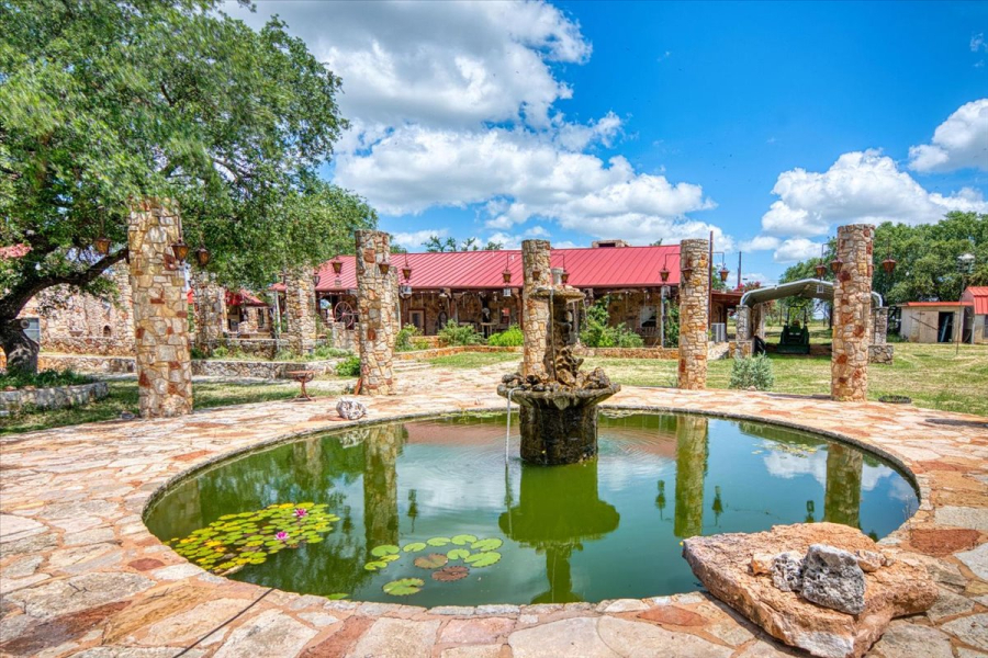 There are approximately 6,000 square feet under roof, highlighted by extensive rockwork, covered porches, outdoor fireplaces, built-in granite tables with benches, fountains, a pond, and a hot tub area.
