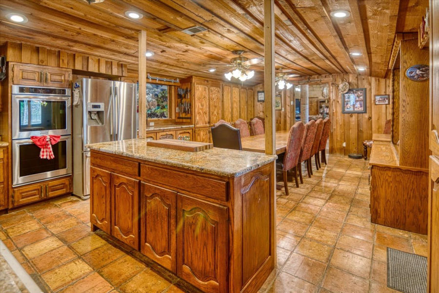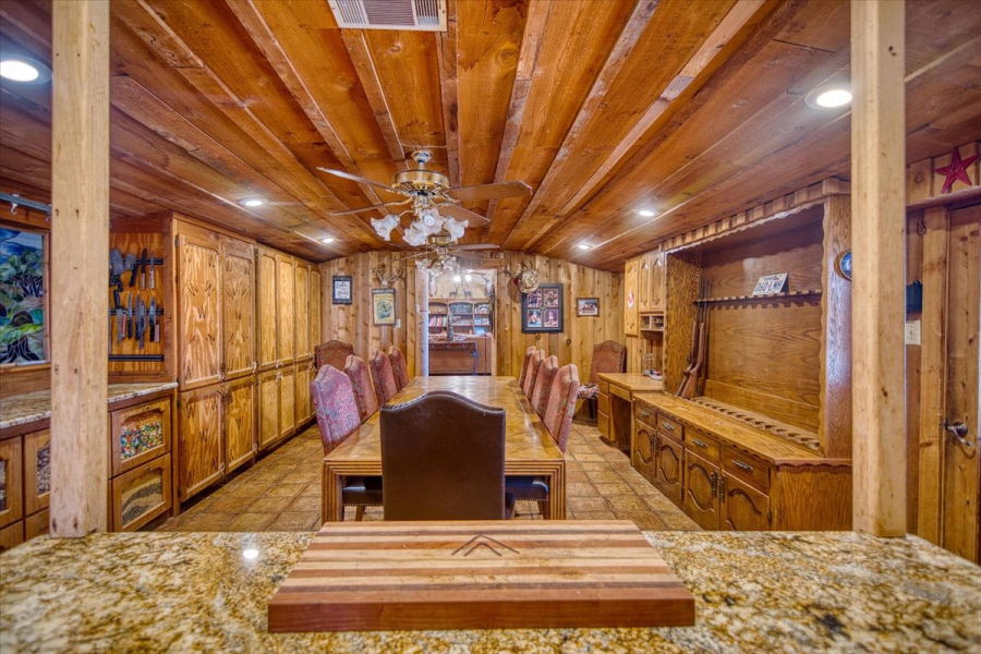 The main home offers four bedrooms and two and a half bathrooms. Its spacious game room features a 15-foot custom bar, wood ceilings, rock walls, and a floor-to-ceiling fireplace, outfitted with a poker table, pool table, and pinball machine—ideal for entertaining or unwinding. Additional living areas include a den with a fireplace and a kitchen with a built-in gun rack.
